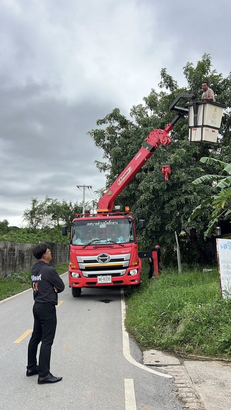 ดร.กิติพงศ์ พงศ์สุรเวท นายกเทศมนตรีตำบลโพธิ์กลาง ติดตามช่างไฟฟ้า เพื่อไปแก้ไขไฟฟ้าดับ ซอยฮากกา หมู่ที่ 1 บ้านหนองปรือ สาเหตุเนื่องจาก สายไฟฟ้าขาด ในระหว่างภาระกิจมอบผ้าอ้อมผู้ใหญ่สำหรับผู้ป่วย