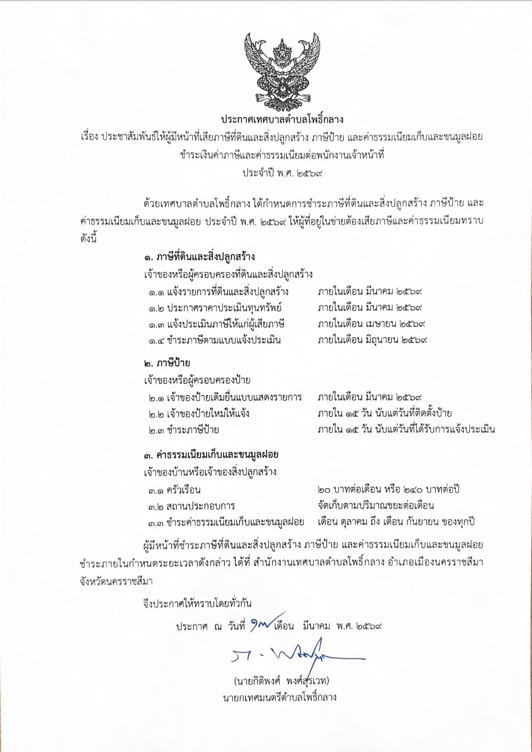 ประกาศ เรื่อง ประชาสัมพันธ์ให้ผู้ที่มีหน้าที่เสียภาษีที่ดินและสิ่งปลูกสร้าง ภาษีป้าย และค่าธรรมเนียมเก็บและขนมูลฝอย ชำระเงินค่าภาษีและค่าธรรมเนียมต่อพนักงานเจ้าหน้าที่ ประจำปี พ.ศ. 2569 |