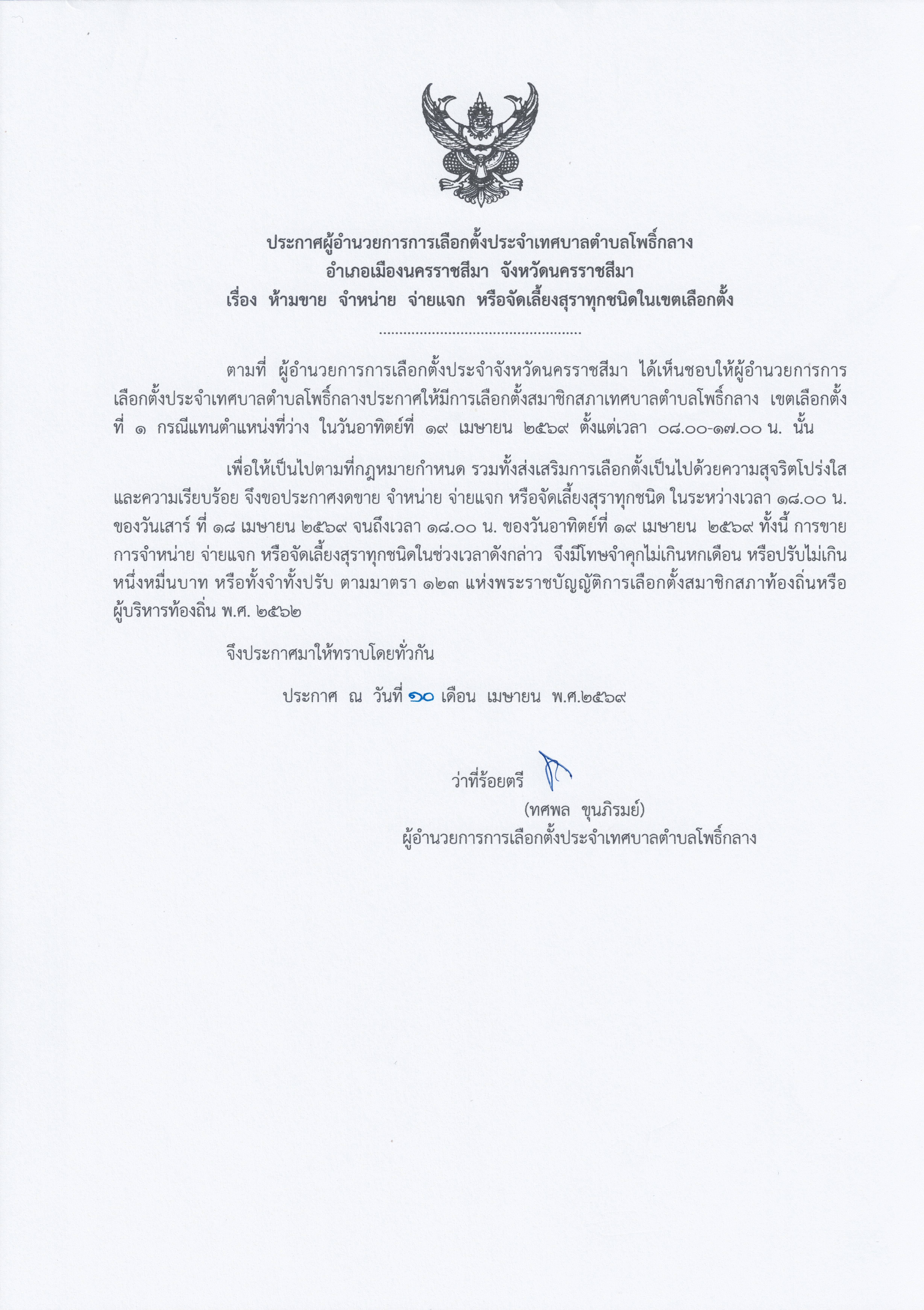 ประกาศผู้อำนวยการเลือกตั้งประจำเทศบาลตำบลโพธิ์กลาง เรื่อง ห้ามขาย จำหน่าย จ่ายแจก หรือจัดเลี้ยงสุราทุกชนิดในเขตเลือกตั้ง |