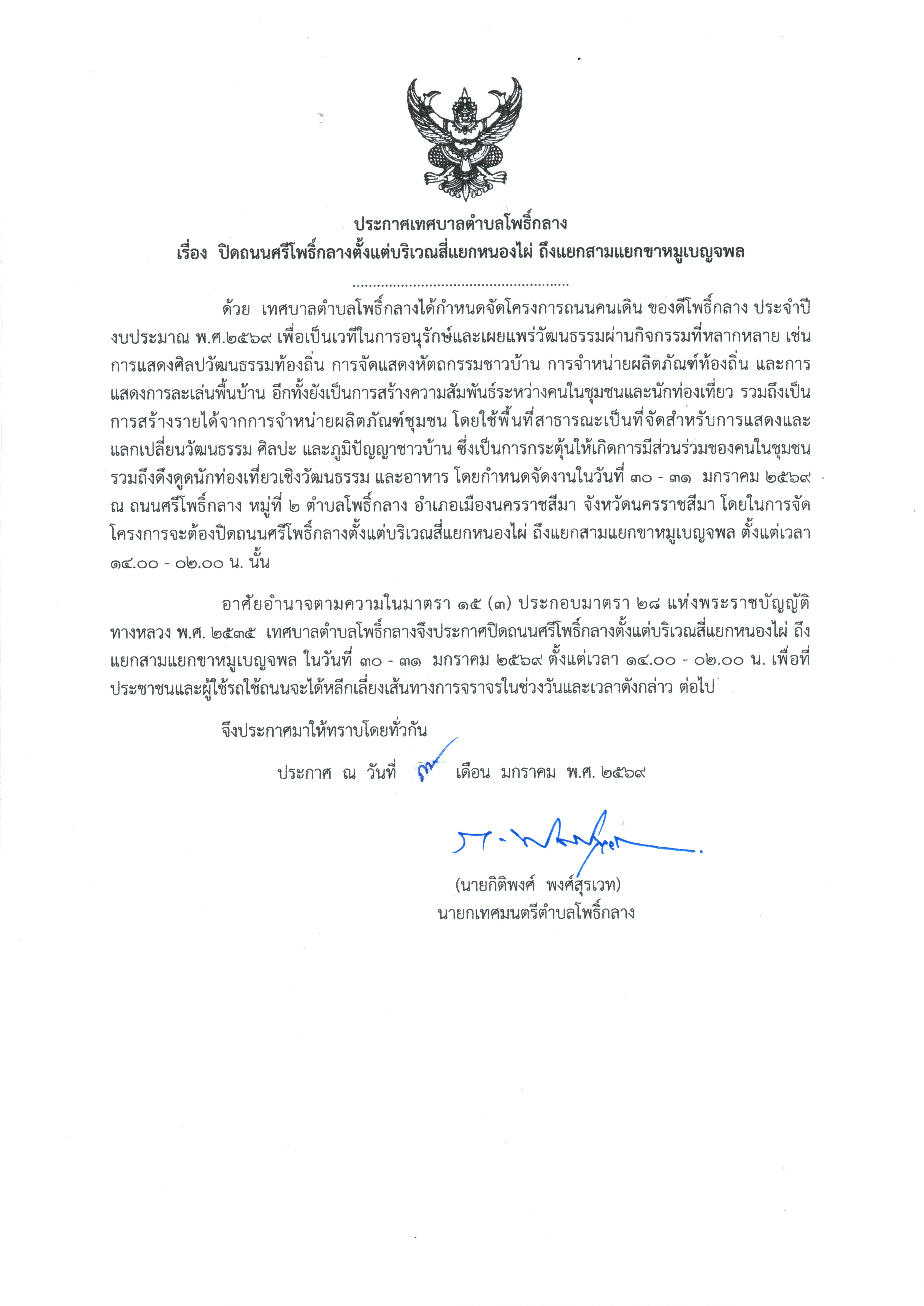 ประกาศ เรื่อง ปิดถนนศรีโพธิ์กลางตั้งแต่บริเวณสี่แยกหนองไผ่ ถึงแยกขาหมูเบญจพล |