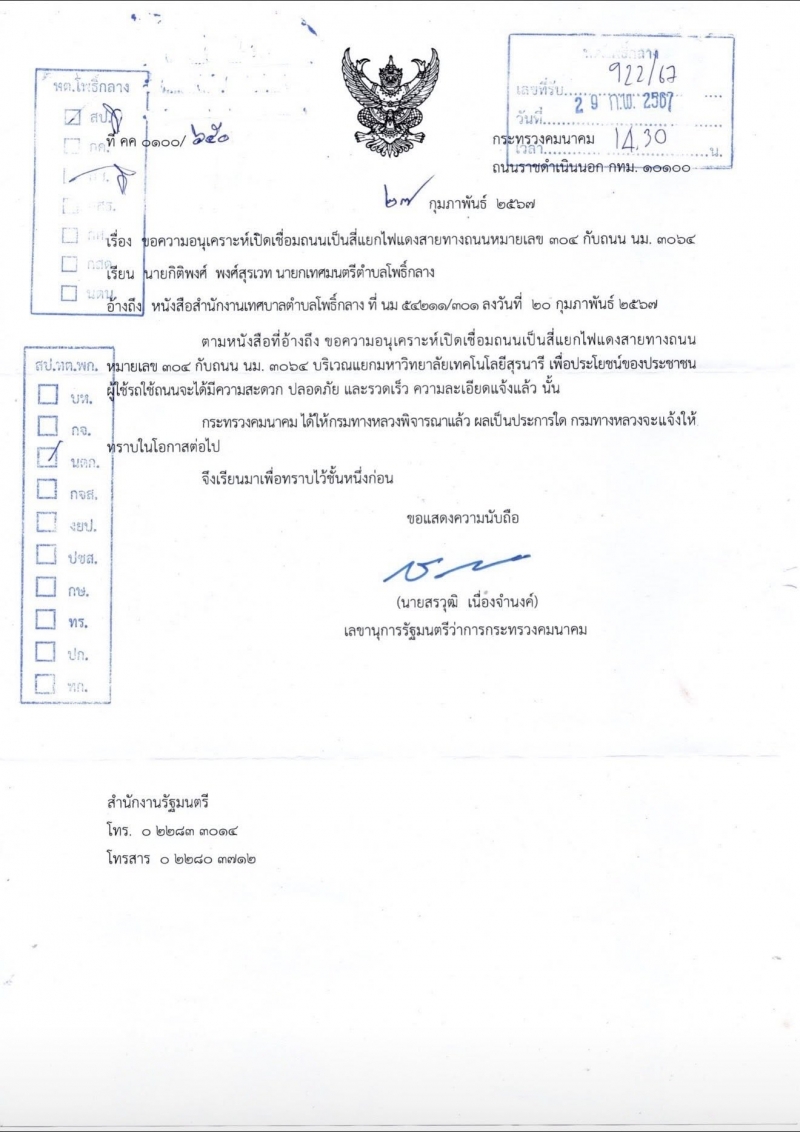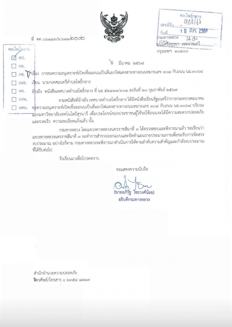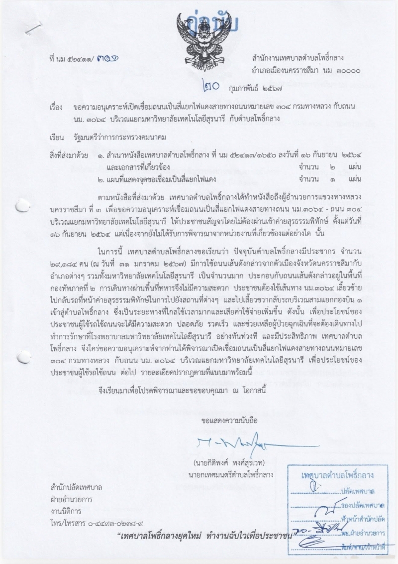 ดร.กิติพงศ์ พงศ์สุรเวท นายกเทศมนตรีตำบลโพธิ์กลาง แสดงความขอบคุณ นายชิตพล เหล่าอัน ผู้อำนวยการแขวงทางหลวงนครราชสีมาที่ 3 ในโอกาสที่โครงการก่อสร้างเชื่อมสี่แยกไฟแดง ถนน 304 (แยก มทส.-เข้าโพธิ์กลาง) ได้รับจัดสรรงบประมาณปี 2569 จำนวน 38,120,000 บาท และดำเนินการประกวดราคาหาผู้รับจ้างเรียบร้อยแล้ว โดยจะเริ่มสัญญาตั้งแต่วันที่26 ธ.ค. 2568 ถึง 23 มิ.ย. 2569 ความสำเร็จในครั้งนี้เกิดจากการผลักดันอย่างต่อเนื่องยาวนานกว่า 4 ปี นับตั้งแต่เริ่มทำหนังสือขอความอนุเคราะห์เมื่อวันที่ 16 ก.ย. 2564 และได้ติดตามความคืบหน้าอย่างใกล้ชิดผ่านที่ประชุม อจร.นม. พร้อมทั้งทำหนังสือถึง นายสุริยะ จึงรุ่งเรืองกิจ รัฐมนตรีว่าการกระทรวงคมนาคม เมื่อวันที่ 20 ก.พ. 2567 โดยประสานงานผ่าน สส.ณัฐจิรา เอี่ยมวิเศษ จนกระทั่ง นายสรวุฒิ เนื่องจำนงค์ เลขานุการ รมว.คมนาคม และ นายอภิรัฐ ไชยวงศ์น้อย อธิบดีกรมทางหลวง ได้มีหนังสือสั่งการให้แขวงทางหลวงฯ ที่ 3 ดำเนินการสำรวจออกแบบและจัดทำแผนงบประมาณเมื่อเดือนมีนาคม 2568 ที่ผ่านมา ซึ่งโครงการนี้จะช่วยลดค่าใช้จ่ายและเพิ่มความสะดวกปลอดภัยในการเดินทางให้แก่ประชาชนอย่างมาก โดยเฉพาะการส่งต่อผู้ป่วยไปยัง รพ.มทส. และ รพ.มหาราชฯ ผ่านพื้นที่ตำบลโพธิ์กลางเข้าสู่ตัวเมืองนครราชสีมาได้อย่างรวดเร็ว