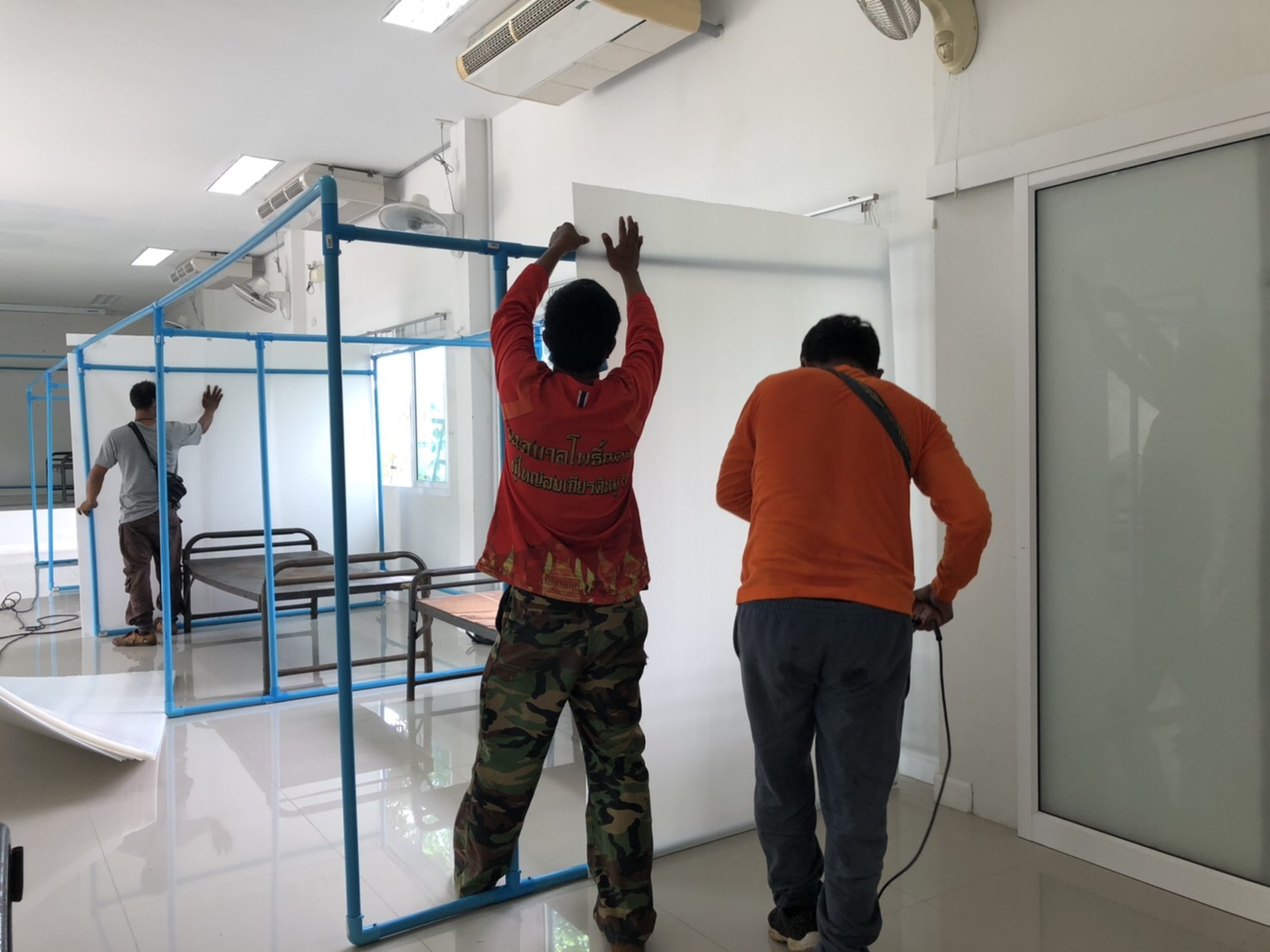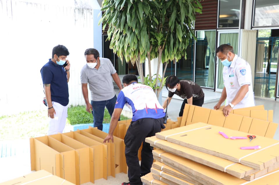 นายกิติพงศ์ พงศ์สุรเวท นายกเทศมนตรีตำบลโพธิ์กลาง และผู้บริหาร สมาชิกสภาเทศบาล ผอ.กองช่าง ผอ.กองสาธารณสุข อสม. ผู้ใหญ่บ้าน เพื่อเร่งสร้างศูนย์พักคอย (SQ.) สโมสรกรมทหารราบที่ 23 ช่วยเหลือประชาชนชาวโพธิ์กลางที่ต้องสัมผัสกับความเสี่ยงโควิด และป้องกันนำเชื้อไปแพร่ในชุมชน (หากติด) กั้นฉากเสร็จ ประกอบเตียง ปูที่นอน จัดของใช้ วางระบบเลขห้องแยกหญิง-ชาย ทำความสะอาด เสร็จเรียบร้อยสวยงาม มีมาตรฐาน เหลือติดกล้องวงจรปิด และจัดจุดคัดกรองนิดหน่อย พร้อมให้ นายแพทย์สาธารณสุขจังหวัดและกรรมการมาประเมินรอบสุดท้าย ก็เปิดศูนย์พักคอยตำบลโพธิ์กลางได้เลย สำหรับผู้ใหญ่บ้านที่จองคิวให้ชาวบ้านที่เดินทางมาจากต่างจังหวัด และผู้ที่สัมผัสแต่พื้นที่บ้านไม่เอื้ออำนวยให้อยู่แยกกันได้ กรุณารอวันพรุ่งนี้ก่อน |
